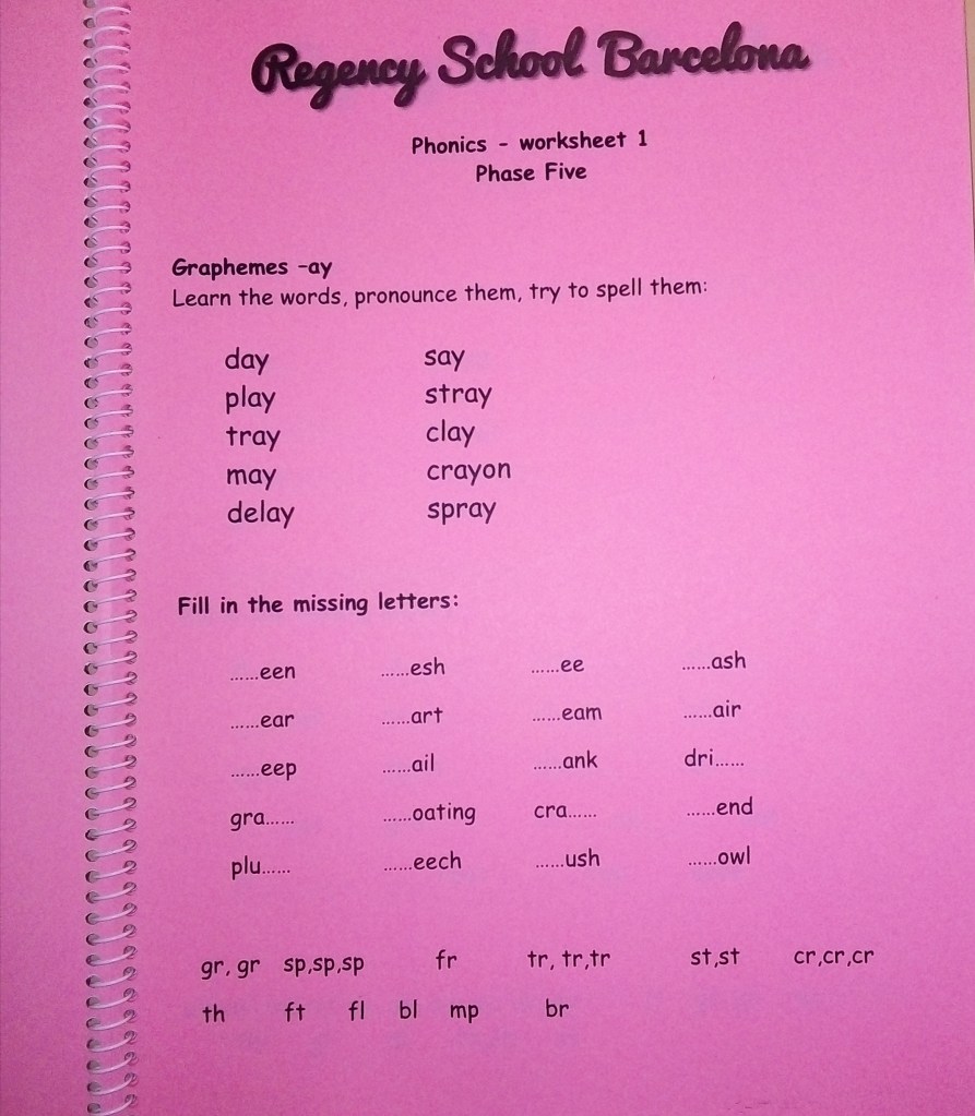 Hay 6 workbooks de la fonética desde la fase 2 hasta la fase 6. Los libros están imprimidos en el papel colorido de cada fase para que sea más fácil para la vista disléxico. Las fonemas vienen acompañado por unos grabaciones de cada worksheet.